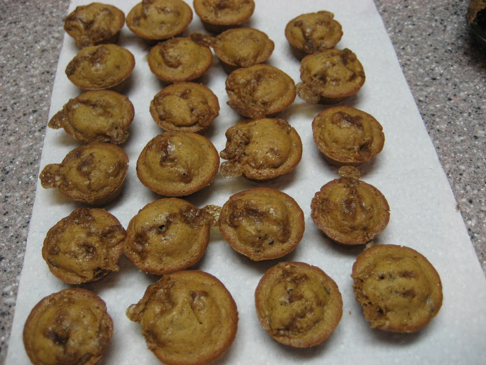 Wait about five minutes before taking them out of the mini-muffin tin. Cool on paper towels. While they're still warm, pop one of the wonderful goodness muffins into your mouth - yum yum yum!!!